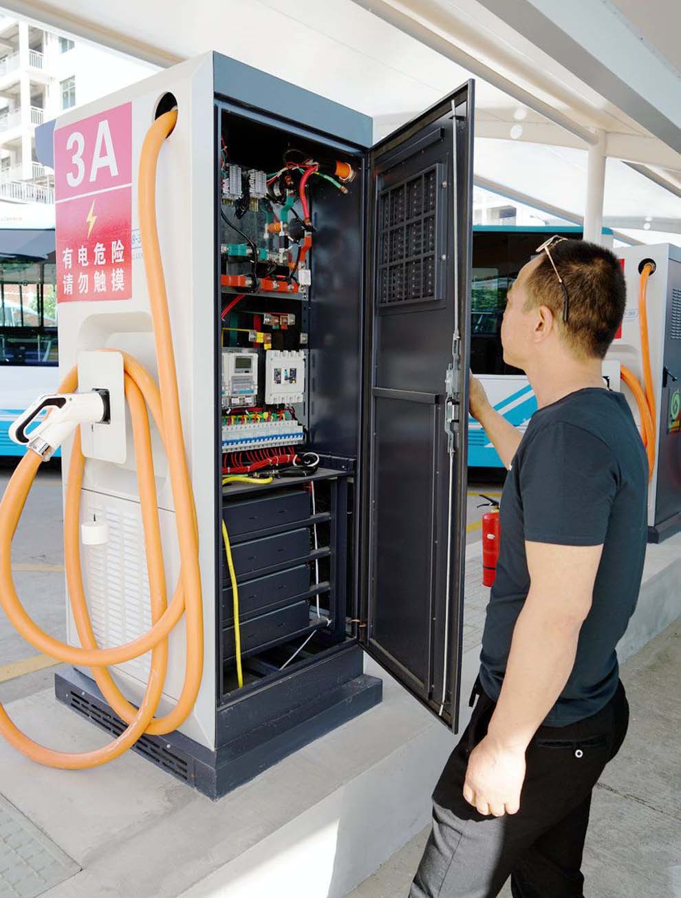 該充電站配備了120kw直流充電樁機組20臺,90kw直流充電機樁10臺,現(xiàn)代化膜結構停車棚1000余平方米。可同時對50臺新能源電動公交車進行充電服務,24小時可以累計完成300余臺新能源電動公交車充電服務。