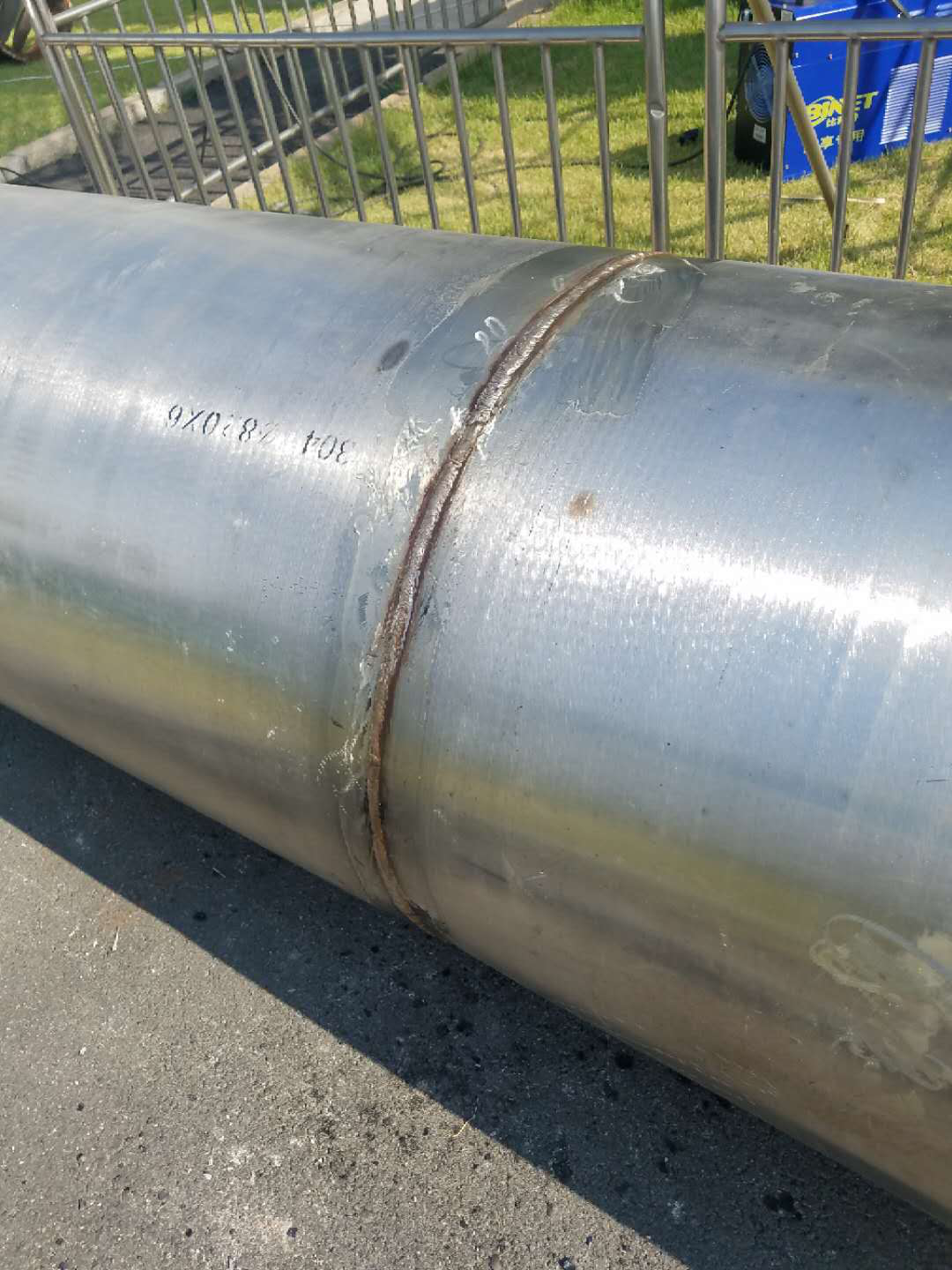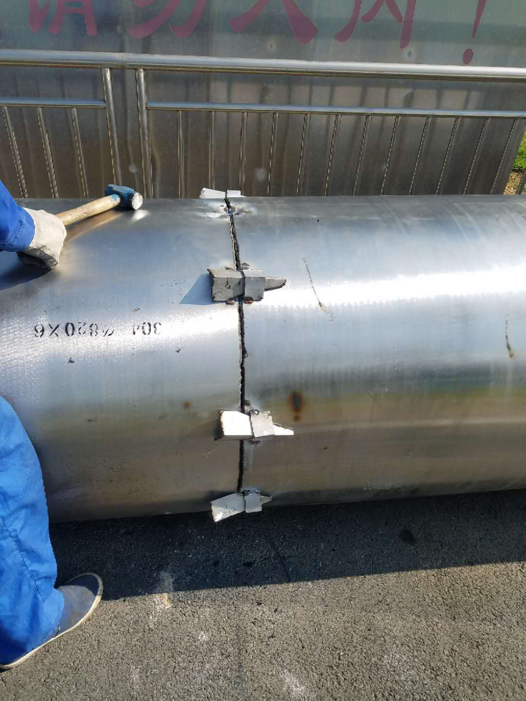 半成品到達現場后,我司專業施工人員對煙囪先對照已繪制好的組裝圖紙開始進行焊接組裝,在開始焊接組裝時,由于不銹鋼管道較厚,為了保證焊接質量和讓焊縫焊透使焊接牢固,現場在焊口對接位用坡口機進行打坡口,合格后再焊接