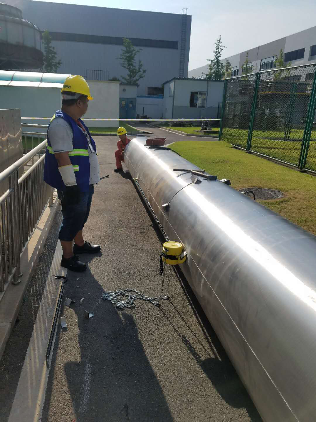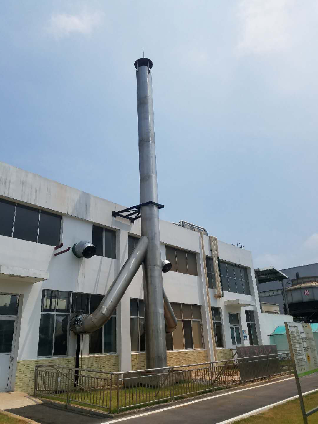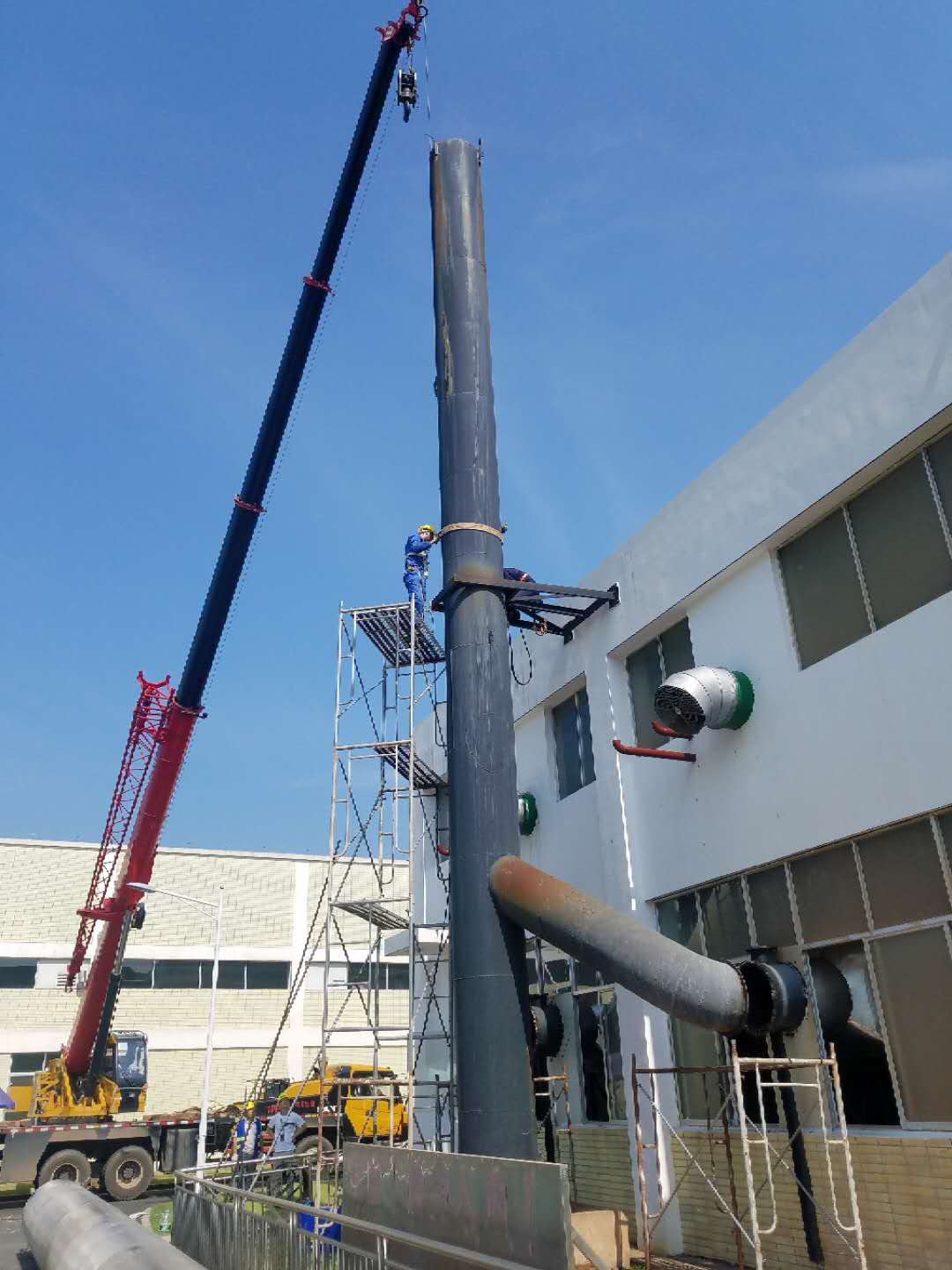 康寶萊星沙工廠鍋爐煙囪使用已達五年之多,原設計為5mm厚普通碳鋼材質,支管ф600mm,主管ф800mm,垂直高度16m。因在2013年經過鍋爐節能改造后,鍋爐排放的煙氣為低溫煙氣(《75°),煙道內冷凝了大部分冷凝水,而中高溫水是強氧化劑,這樣煙氣冷凝水(含硫)對碳鋼煙囪腐蝕氧化嚴重。經過專業檢測人員對鍋爐煙囪做檢測,只有1.5mm厚 ,存在倒塌安全隱患,并且煙囪頂帽固定支桿腐蝕嚴重,有被狂風刮落的安全隱患。由于存在以上的安全隱患,康寶萊公司決定對鍋爐煙囪及材質進行更換改造。經過多次的對我司考察后,從眾多公司中選取出來,由我星澤公司對承擔煙囪此任務。