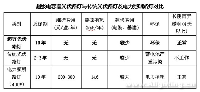 (一)傳統光伏路燈采用鉛酸蓄電池等電池,一般這種電池具有壽命短,陰雨天不能充電,重金屬對環境污染大等缺點。本項目使用的儲能電源為我公司專門為太陽能光伏道路照明設計生產的新型能量型超級電容器模組,該模組循環壽命長(可達2萬多次),可以實現連續陰雨天(>15天)充放電,因此能夠保證在連續陰雨天的情況下也能正常供電提供照明,不會影響整個路燈的正常工作,而且該種儲能模組節能環保無污染。