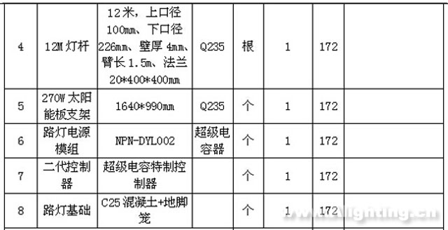 在太陽能路燈系統中,結構上一個需要非常重視的問題就是抗傾覆計算設計。抗傾覆計算設計主要分為兩大塊,一為電池組件支架的抗傾覆計算設計,二為燈桿的抗傾覆計算設計。傾覆(風)設計主要按照不同桿型的迎風面積進行燈桿強度和燈桿基礎的設計計算,設計風速≥35m/s,抗震度為8級。經計算設計,本工程所有燈桿能滿足上述要求。