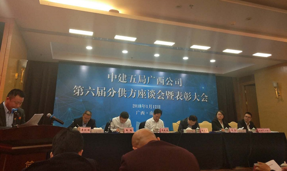 2018年1月12日中建五局廣西分公司在廣西召開了第六屆分供方座談會暨表彰大會。我公司憑借專業的施工水平、科學的項目管理模式以及積極良好的服務態度,保質保量保進度的,圓滿完成施工任務,被中建五局廣西分公司授予“優秀供應商”稱號。
